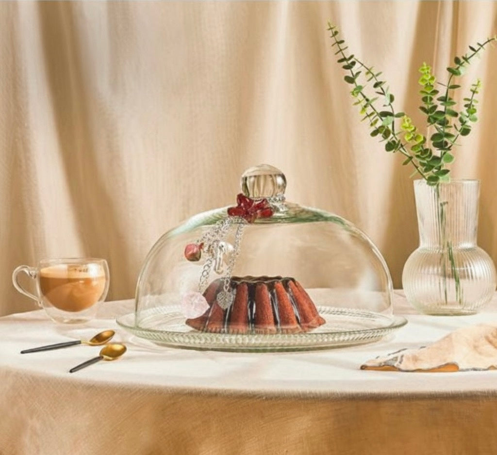 Exquisite glass tart plate, featuring a textured base and a high-clear glass dome. The dome is beautifully accented with a silver-toned chain and a decorative glass pieces That add a touch of vintage charm to your tabletop.
