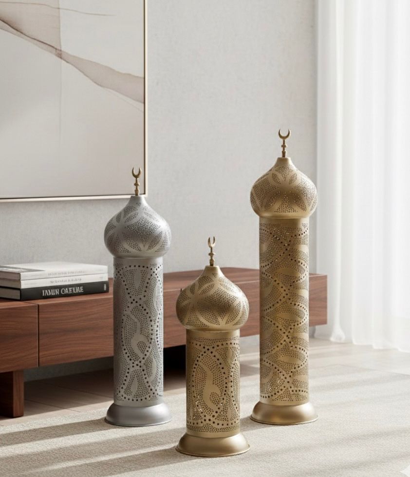 Set of 3 elegant, perforated metal minarets featuring intricate geometric patterns and traditional crescent finials in brushed gold and silver finishes.