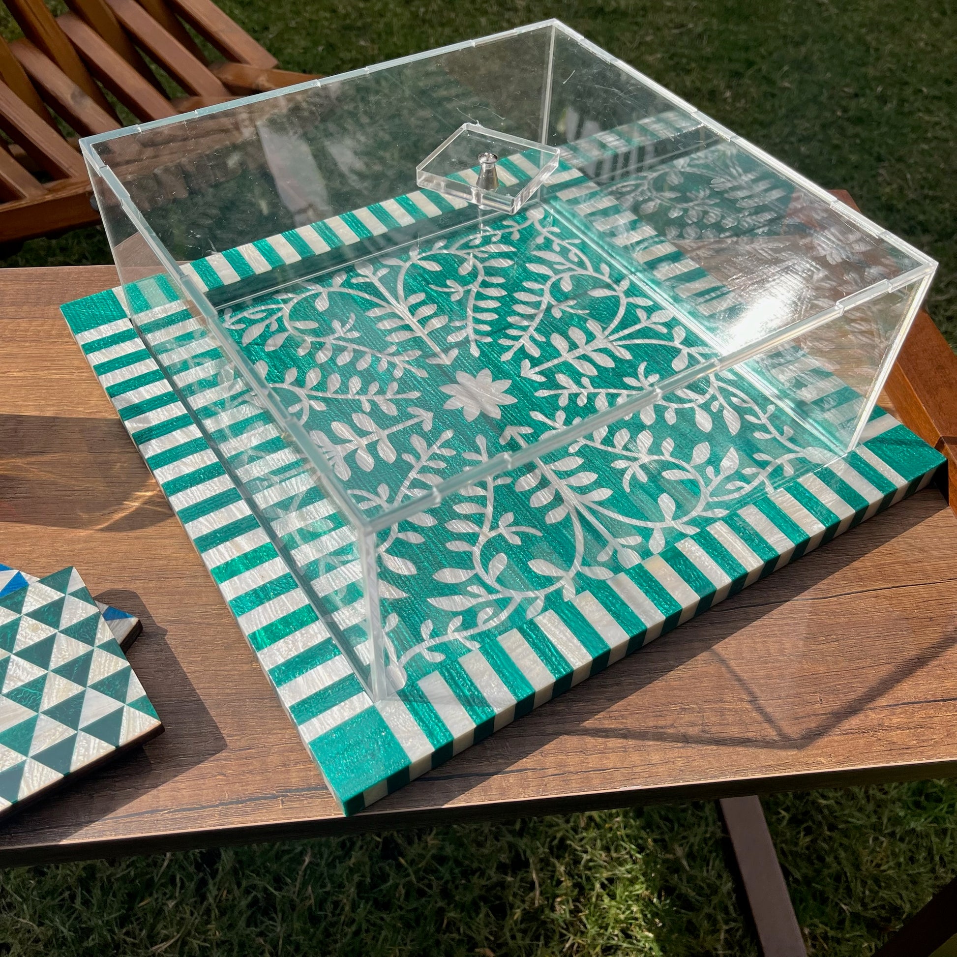 Handcrafted tray, blending traditional artistry with a modern twist. The base features exquisite floral inlay work crafted from manufactured mother of pearl. The tray comes with a clear acrylic cover that not only adds a contemporary look but also making it perfect for indoor or outdoor gatherings.