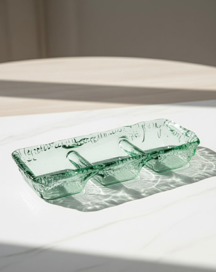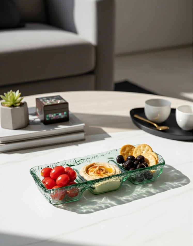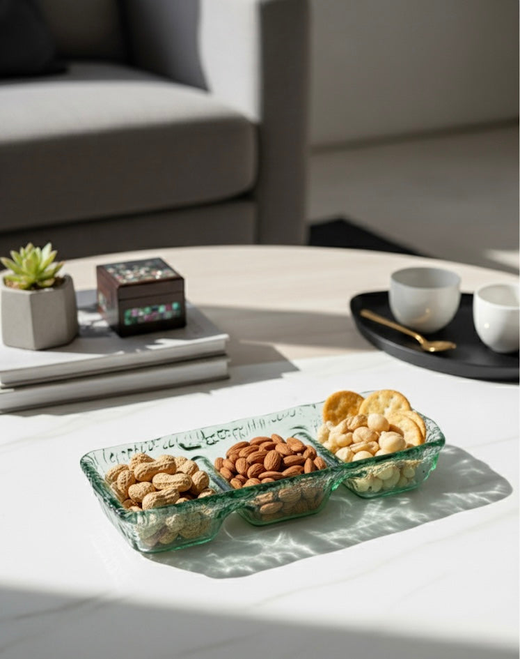 A stylish three-section glass serving bowl perfect for snacks, dips, and small bites.Its modern textured design adds elegance to any table setting or gathering.